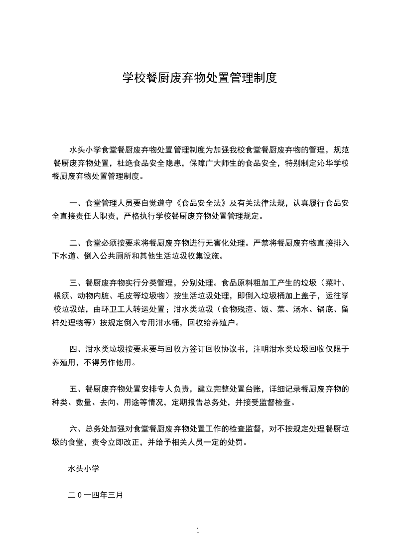 水头小学食堂餐厨废弃物处置管理制度为加强我校食堂餐厨废弃物的管理,规范餐厨废弃物处置,杜绝食品安全隐患,保障广大师生的食品安全,特别制定沁华学校餐厨废弃物处置管理制度。