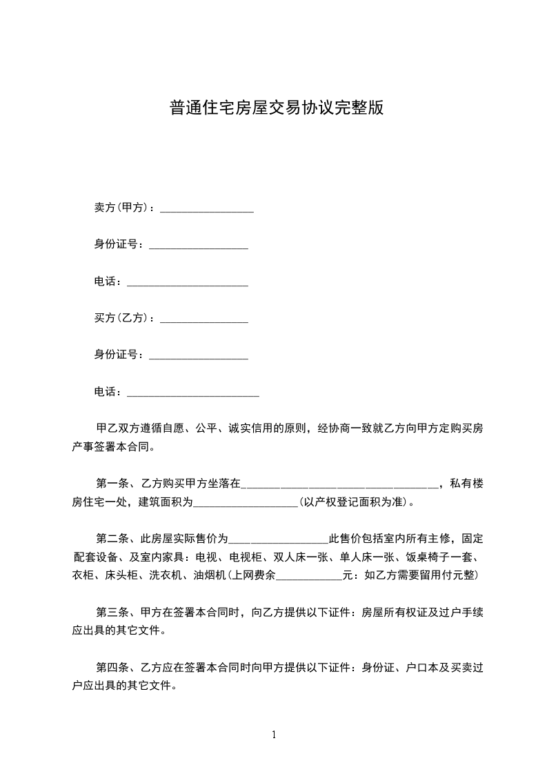 第二条、此房屋实际售价为__________________此售价包括室内所有主修,固定配套设备、及室内家具:电视、电视柜、双人床一张、单人床一张、饭桌椅子一套、衣柜、床头柜、洗衣机、油烟机(上网费余____________元:如乙方需要留用付元整)。