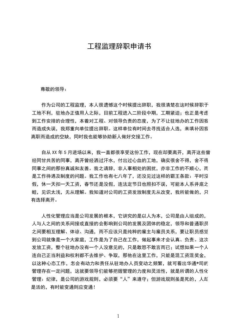 自从XX年5月进场以来,我一直都很享受这份工作,现在却要离开,离开这些曾经同甘共苦的同事,离开曾经洒过汗水,付出过心血的工地,确实很舍不得,舍不得同事之间的那份真诚和友善。我之请辞,非人事相处的困扰,亦非工作的不顺心,而是工作待遇及制度的问题。我工作也有七八年了,还没见过这样的霸王条款:平时没假,休一天扣一天工资,春节还是没假,连法定节日也照扣不误,可能本人系井底之蛙,见识太浅,无从理解。我知道对公司的工资发放制度无从改变,我所能做的,只有选择离开。