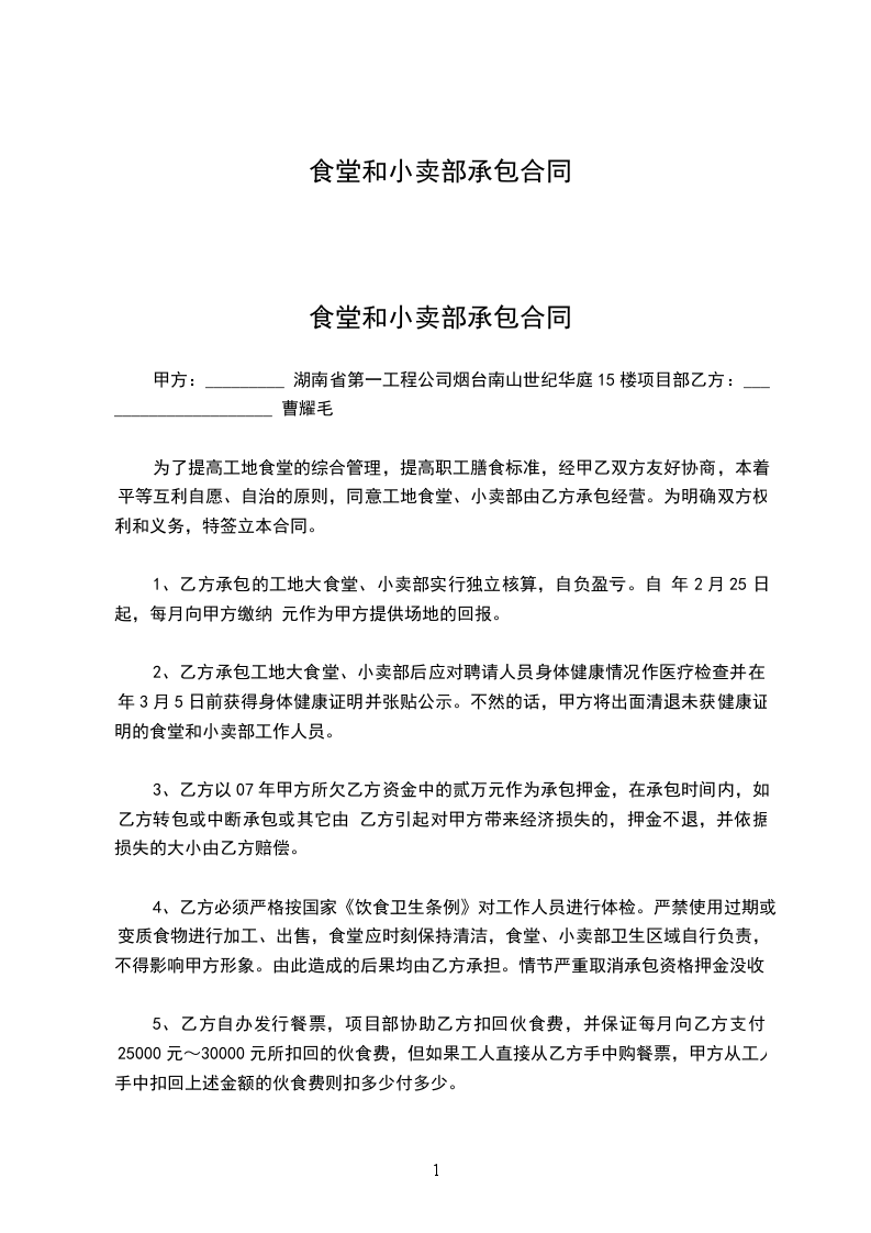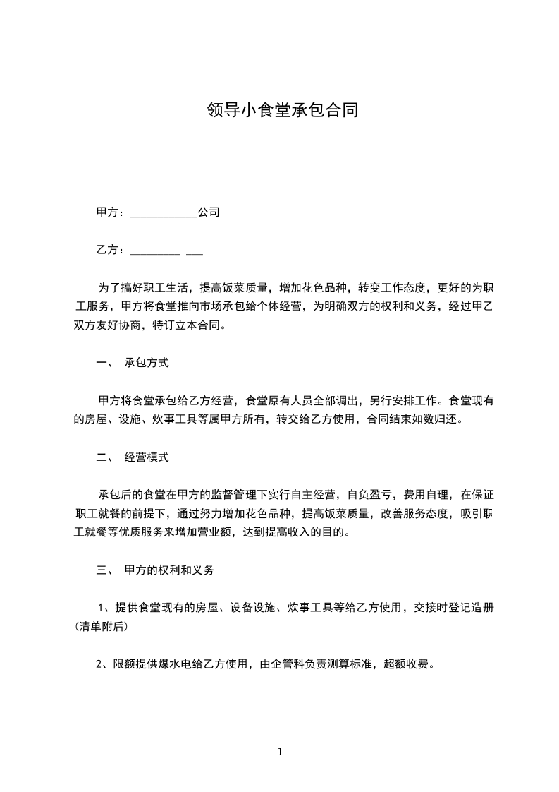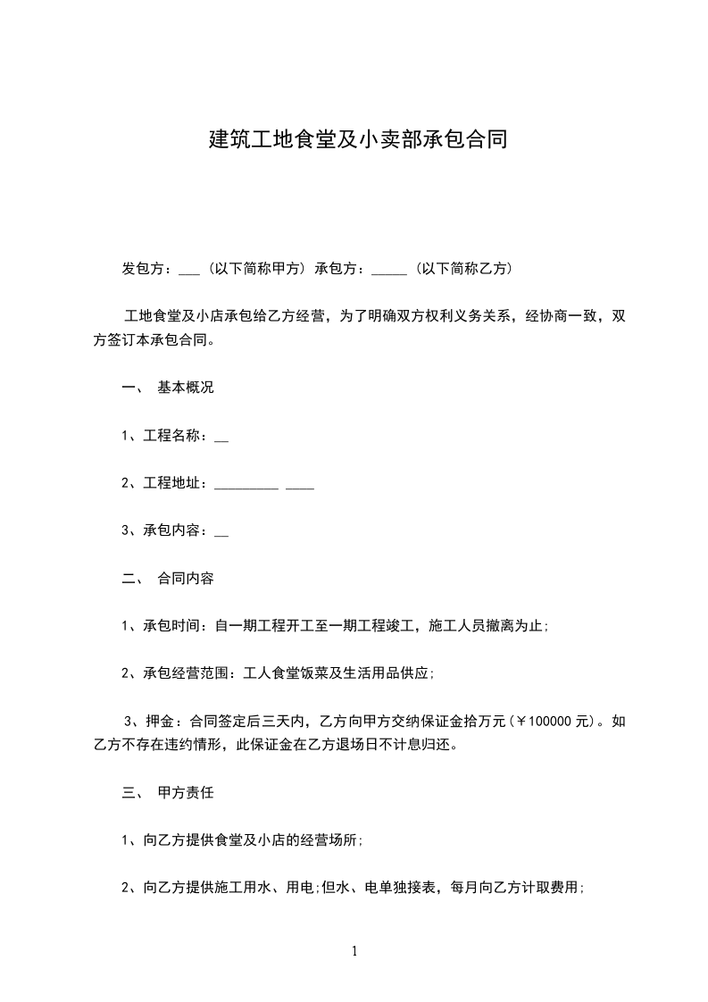 为了提高工地食堂的综合管理,提高职工膳食标准,经甲乙双方友好协商,本着平等互利自愿、自治的原则,同意工地食堂、小卖部由乙方承包经营。为明确双方权利和义务,特签立本合同。