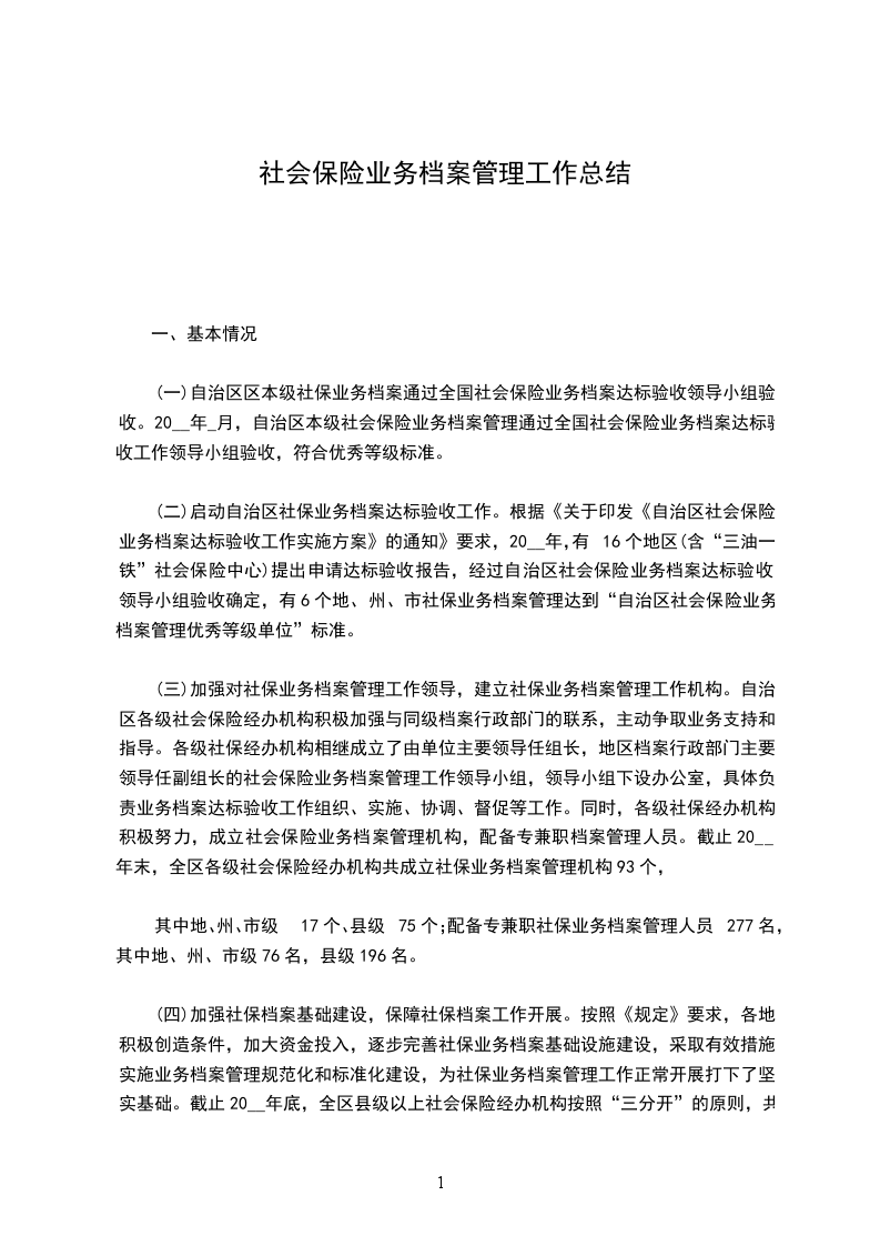(一)自治区区本级社保业务档案通过全国社会保险业务档案达标验收领导小组验收。20__年_月,自治区本级社会保险业务档案管理通过全国社会保险业务档案达标验收工作领导小组验收,符合优秀等级标准。