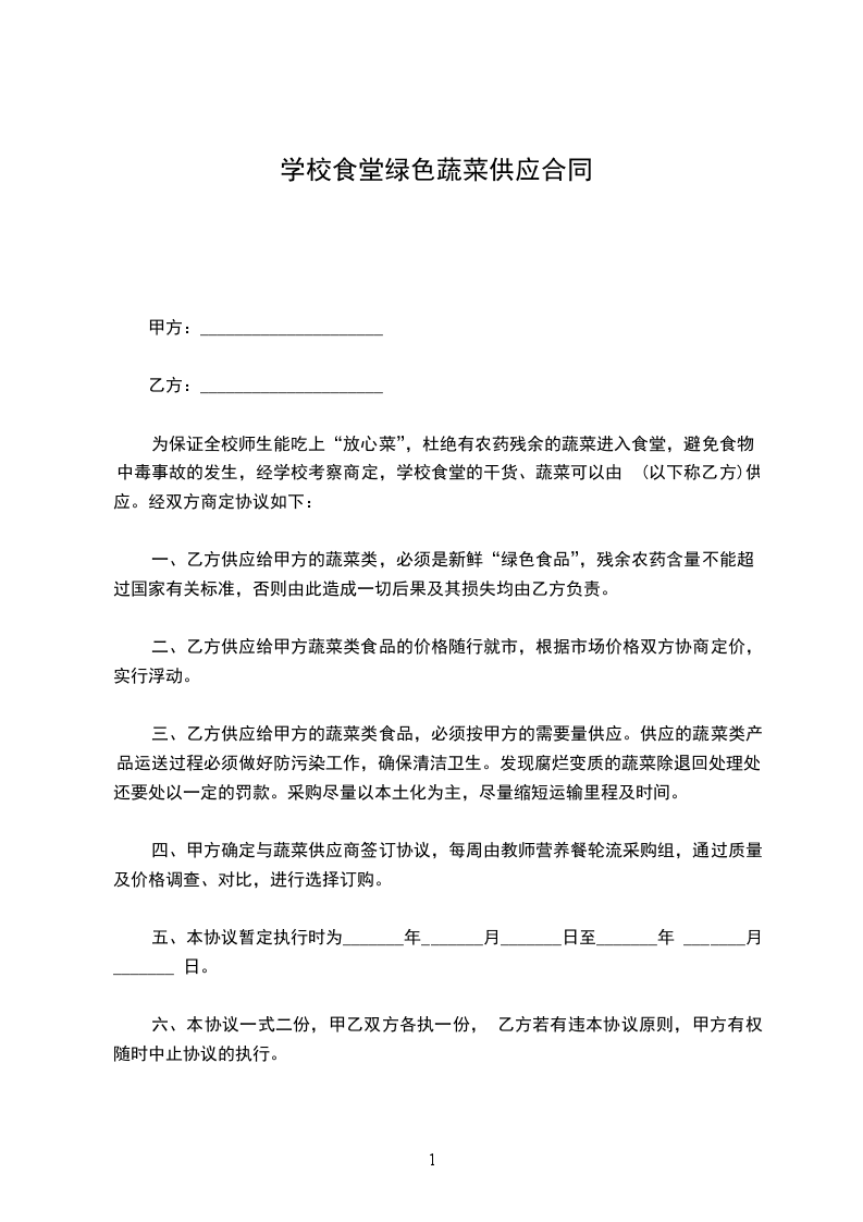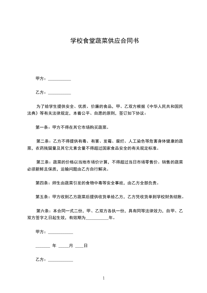 为了给学生提供安全、优质、价廉的食品,甲、乙双方根据《中华人民共和国民法典》等有关法律规定,本着公平、自愿的原则,签订如下协议: