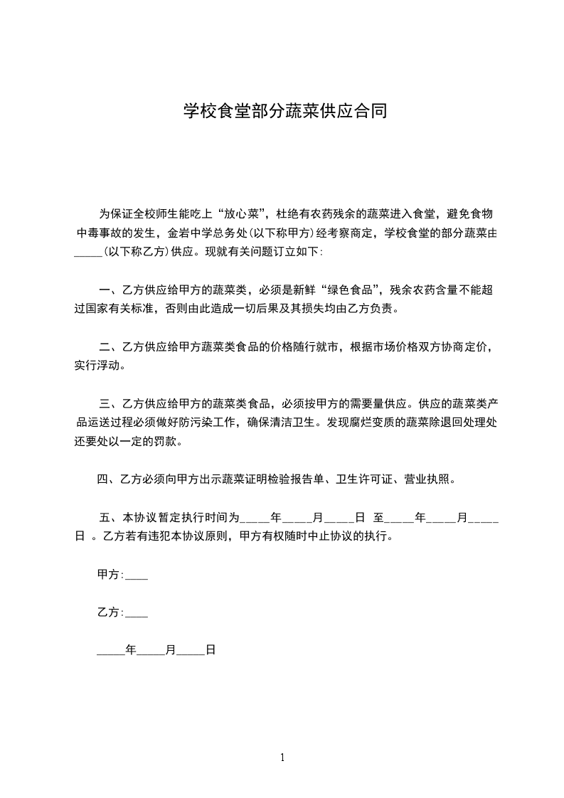 第五条:甲方收到乙方蔬菜后提供收货单给乙方,乙方凭收货单到学校财务结账。