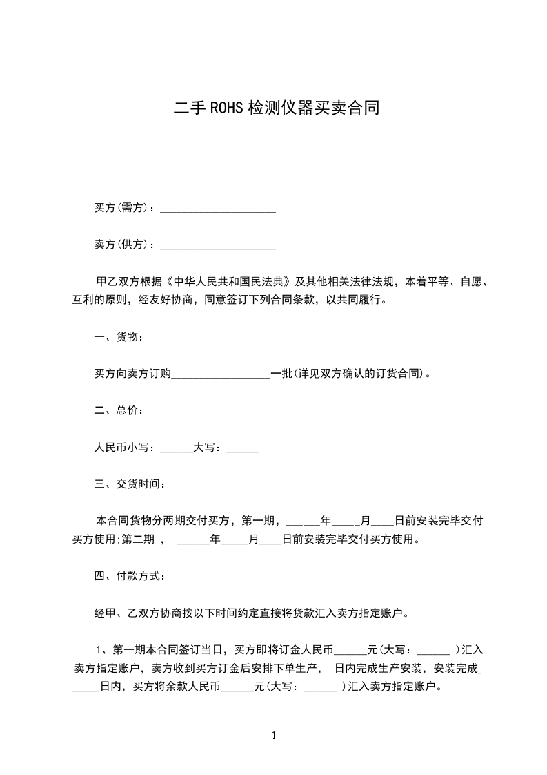 1、第一期本合同签订当日,买方即将订金人民币______元(大写:______ )汇入卖方指定账户,卖方收到买方订金后安排下单生产, 日内完成生产安装,安装完成______日内,买方将余款人民币______元(大写:______ )汇入卖方指定账户。