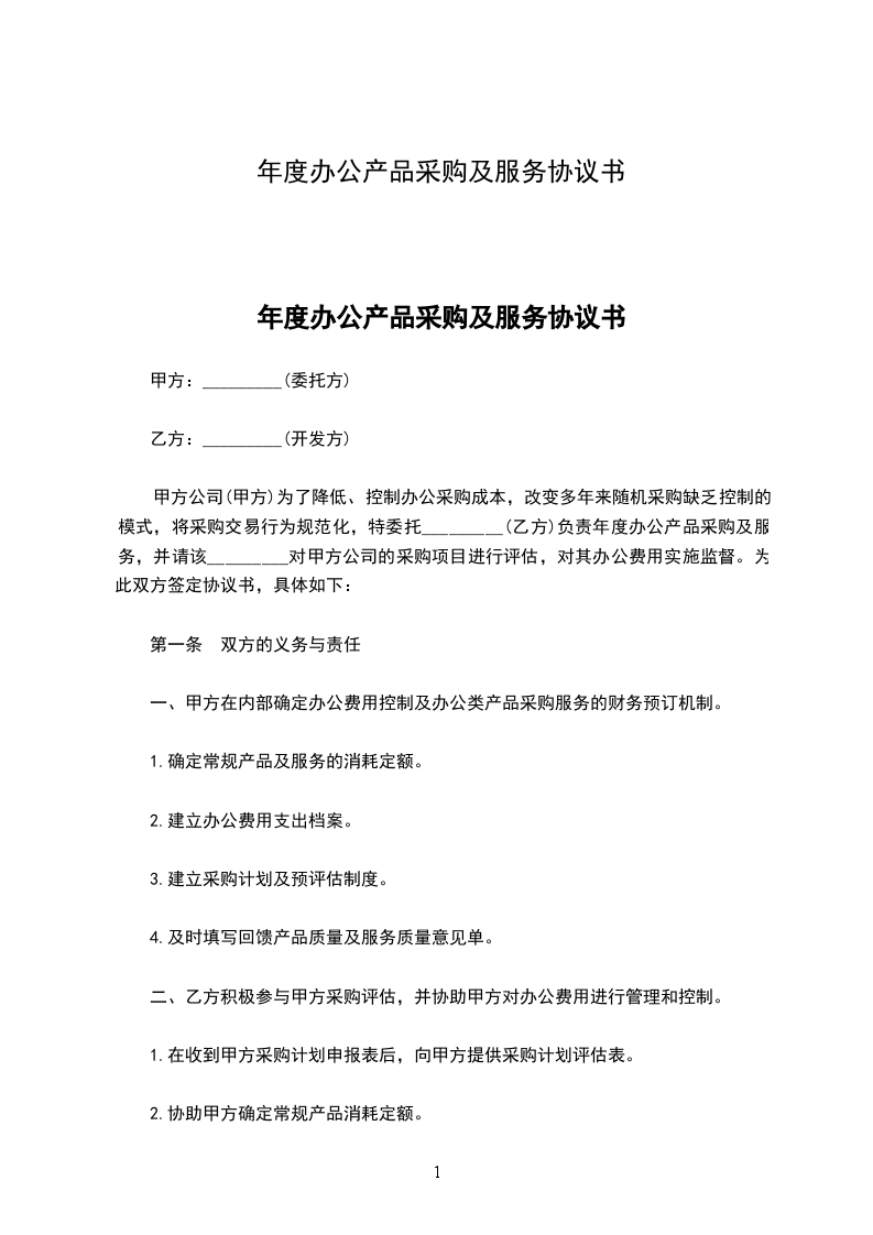 甲方公司(甲方)为了降低、控制办公采购成本,改变多年来随机采购缺乏控制的模式,将采购交易行为规范化,特委托_________(乙方)负责年度办公产品采购及服务,并请该_________对甲方公司的采购项目进行评估,对其办公费用实施监督。为此双方签定协议书,具体如下: