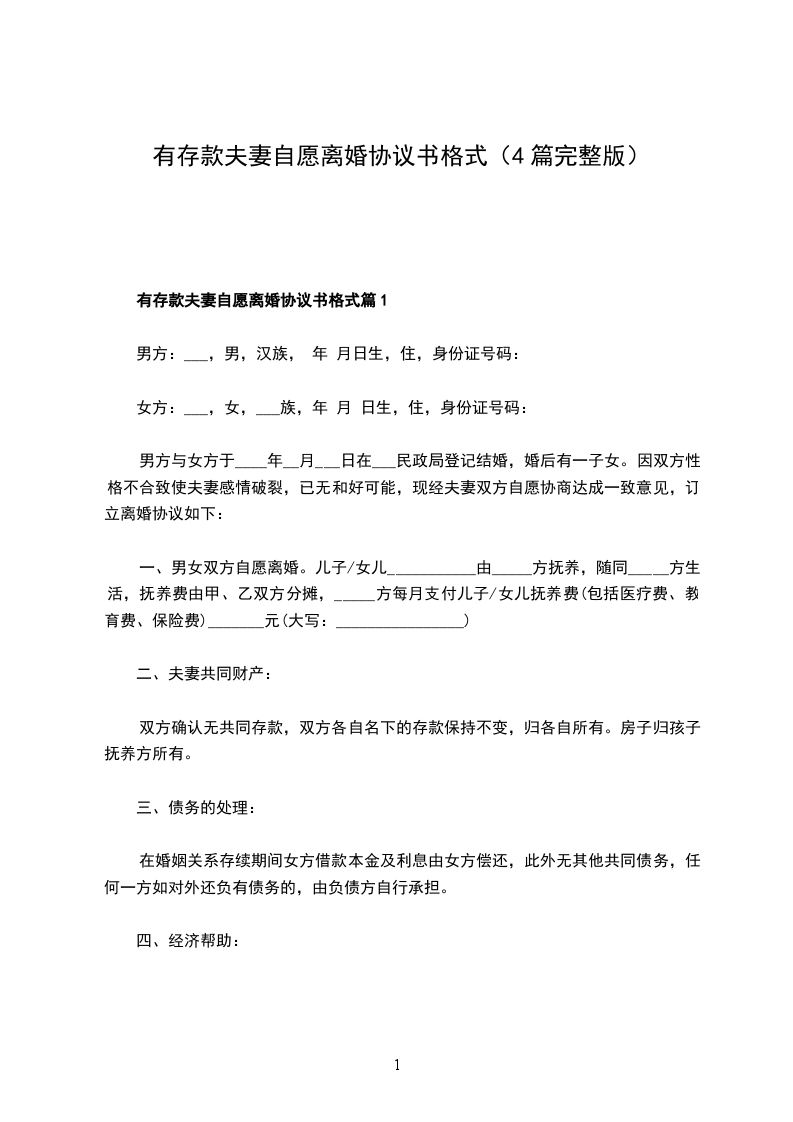 有存款自愿离婚协议书格式篇1