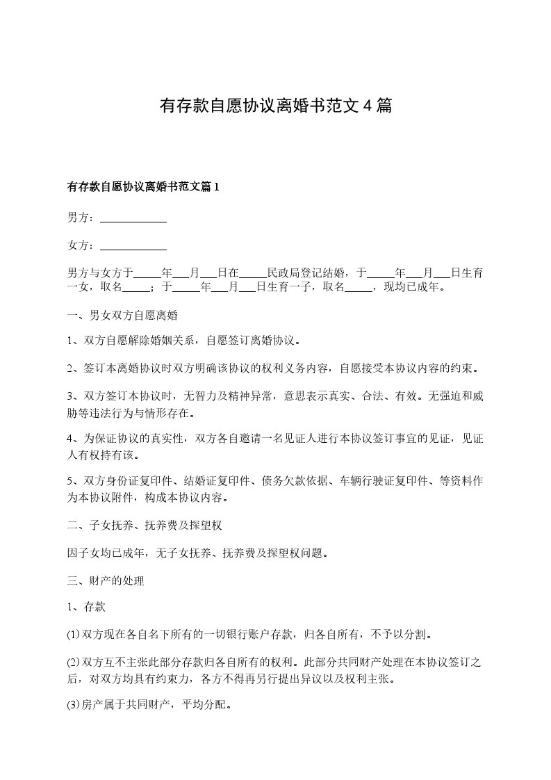 有存款自愿离婚协议书格式篇3