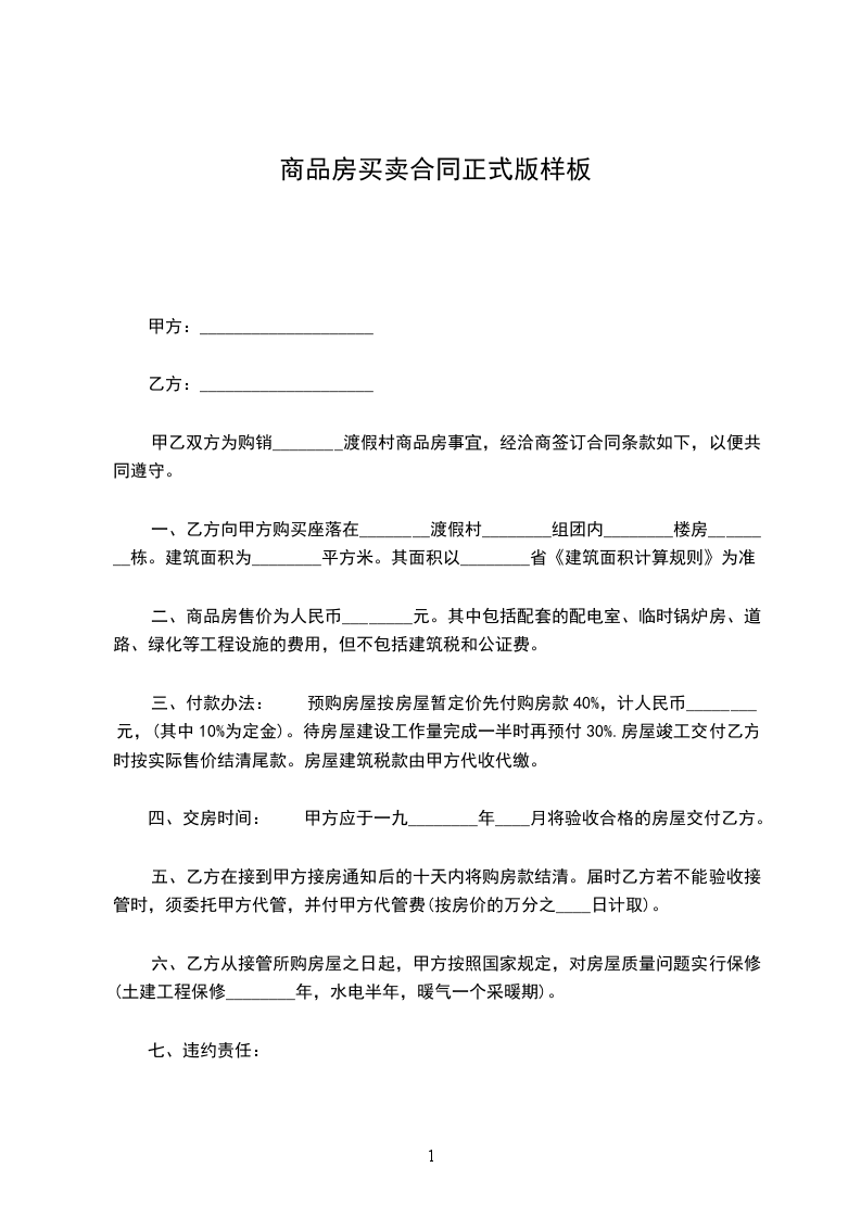 一、乙方向甲方购买座落在________渡假村________组团内________楼房________栋。建筑面积为________平方米。其面积以________省《建筑面积计算规则》为准。
