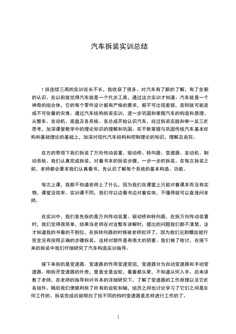 1班连续三周的实训说长不长,我收获了很多。对汽车有了新的了解,有了全新的认识。在以前就觉得汽车就是一个代步工具,通过这次实训才知道:汽车就是一个神奇的组合体,它的每个零件设计都有严格的要求,都不可出现差错,否则就可能造成不可估量的灾难。通过汽车结构拆装实训,进一步巩固和掌握汽车的构造和原理。从整车、发动机、底盘及各系统、各总成开始认识汽车,经过拆装实践和举一反三的思考,加深课堂教学中的理论知识的理解和巩固。在不断掌握与巩固传统汽车基本结构和基础理论的基础上,加深对现代汽车结构和控制理论的知识,理解及追究。