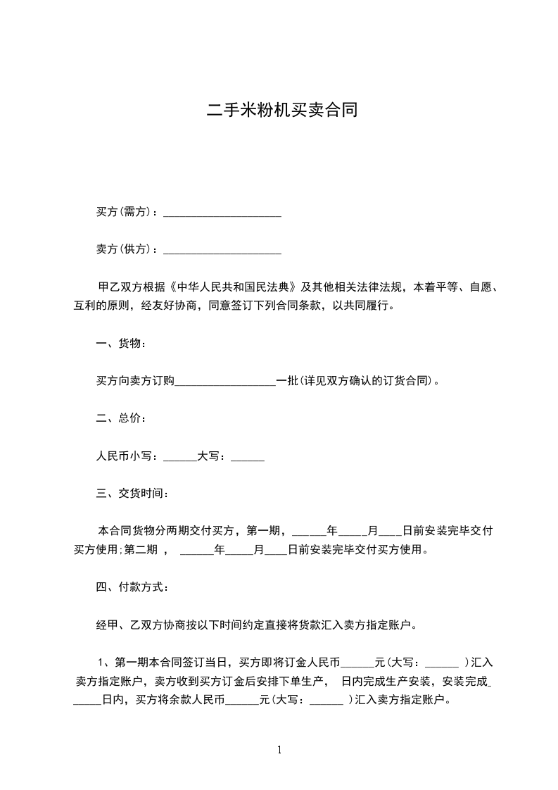 1、第一期本合同签订当日,买方即将订金人民币______元(大写:______ )汇入卖方指定账户,卖方收到买方订金后安排下单生产, 日内完成生产安装,安装完成______日内,买方将余款人民币______元(大写:______ )汇入卖方指定账户。