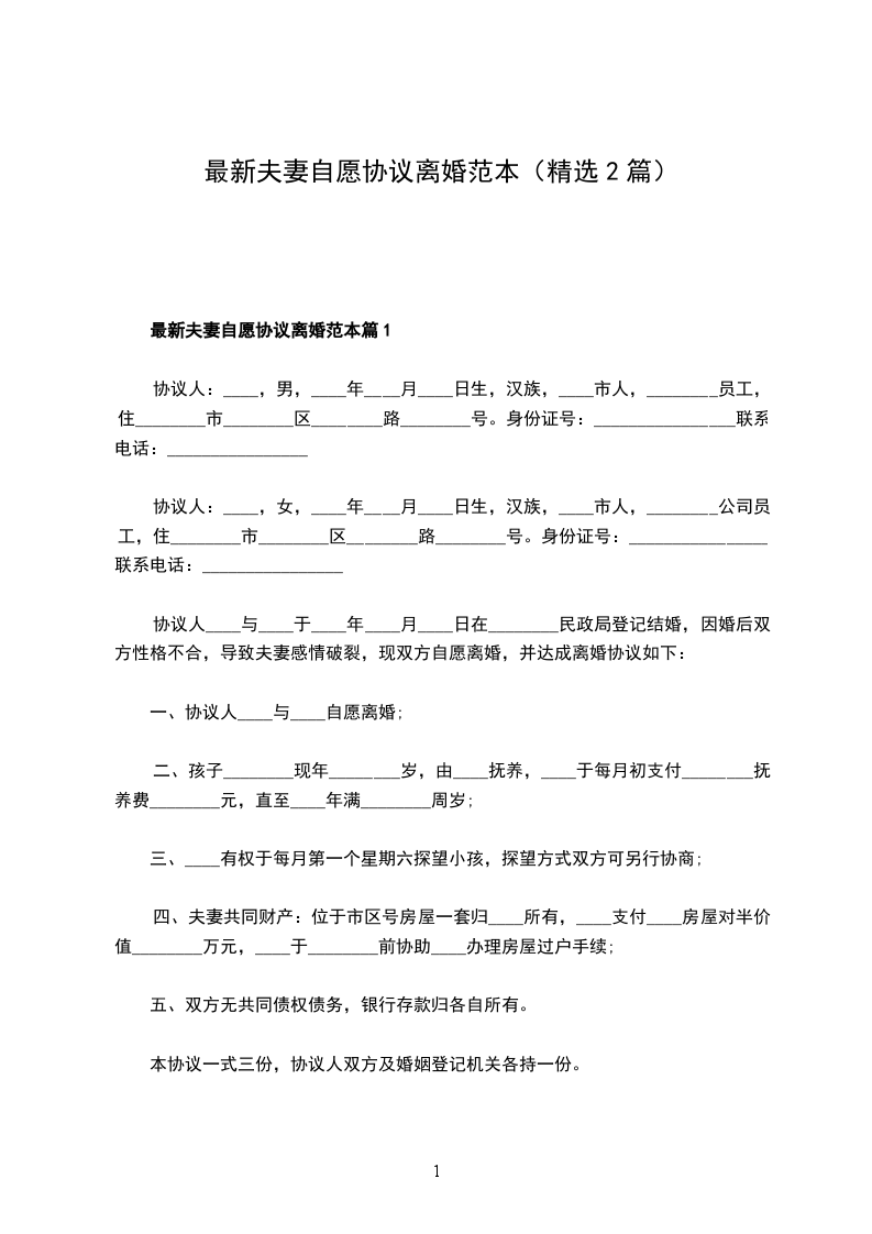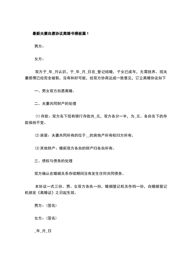 最新夫妻自愿离婚协议模板篇1