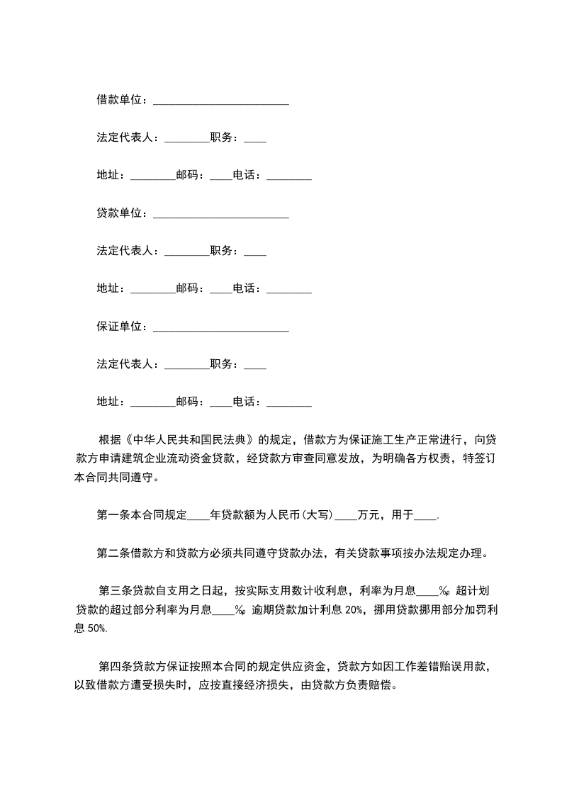 根据《中华人民共和国民法典》的规定,借款方为保证施工生产正常进行,向贷款方申请建筑企业流动资金贷款,经贷款方审查同意发放,为明确各方权责,特签订本合同共同遵守。