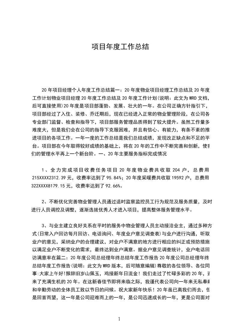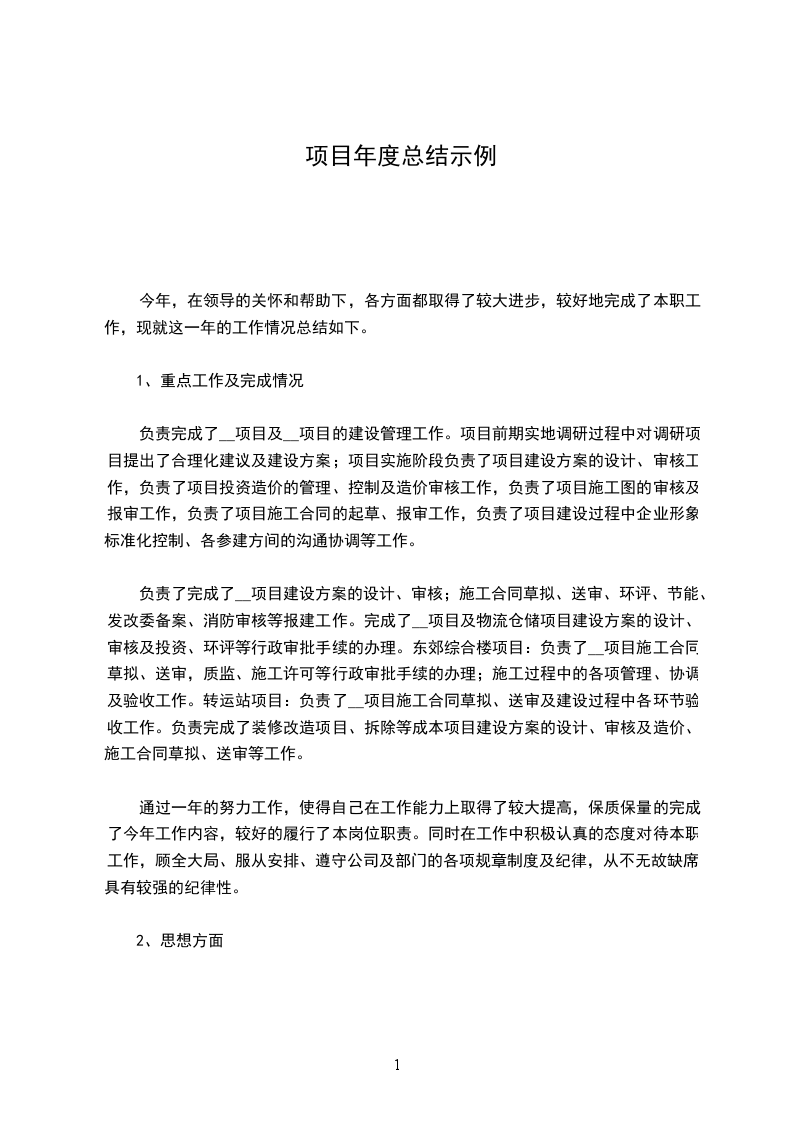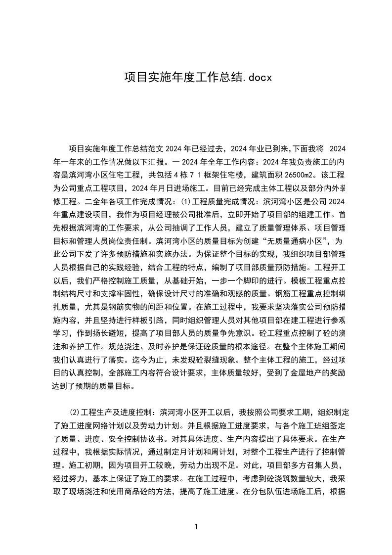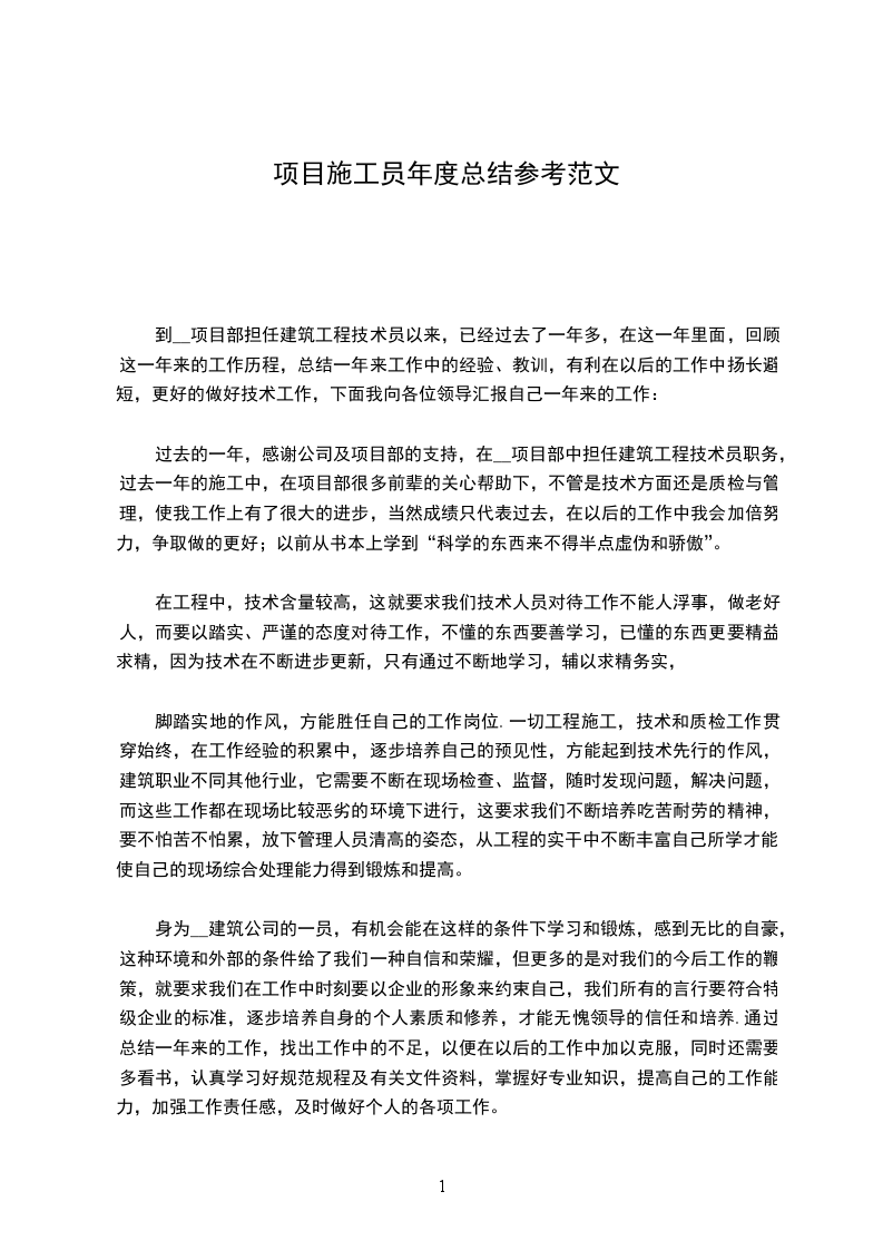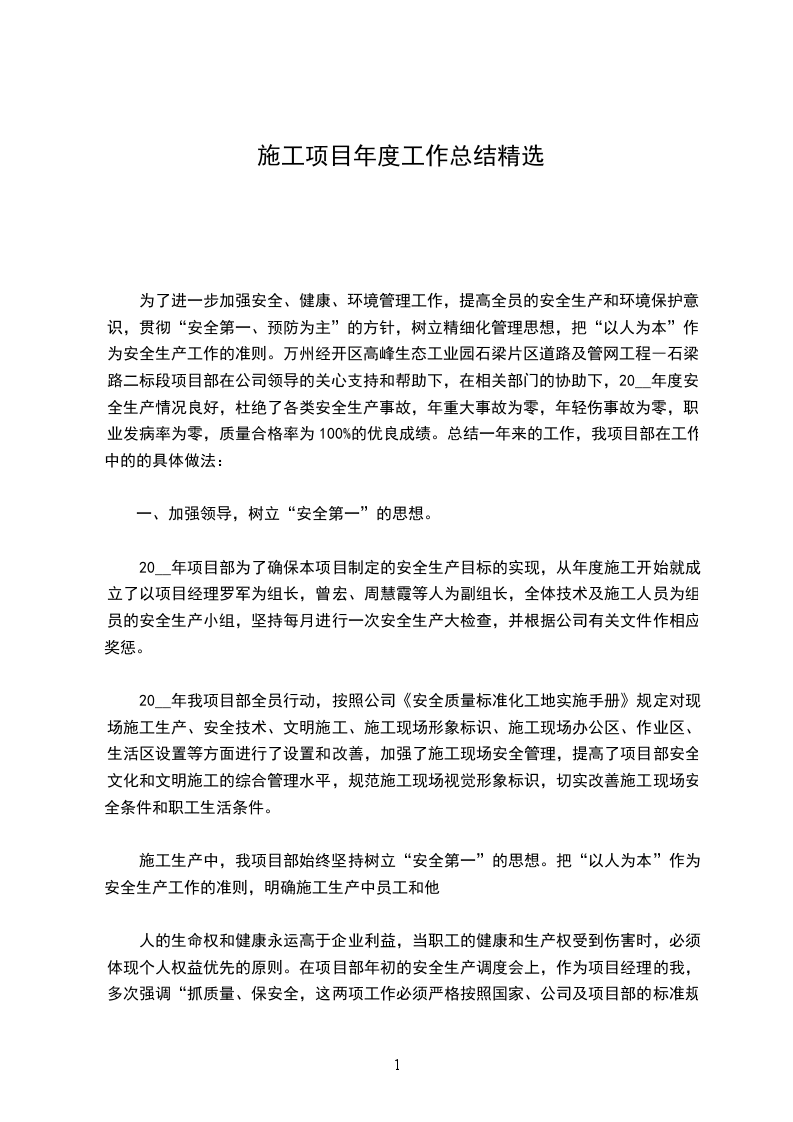 在20__年的工程施工过程中,项目部团结一致,并得到建设单位、监理单位和当地政府部门的关心与支持,在工程安全及文明施工、质量等方面取得了较好效果,同时,在工程中积极应用新工艺、新技术、新材料。通过今年施工获得的经验,将在明年的施工管理中得以发挥和实践,获得的教训,也将在今后的施工中作为工作的重点,得到足够的重视,采取有效措施改进,使企业的自身素质和管理水平不断提高,将__工程建成真正的优质工程、样板工程,为__室的建设事业做出贡献。