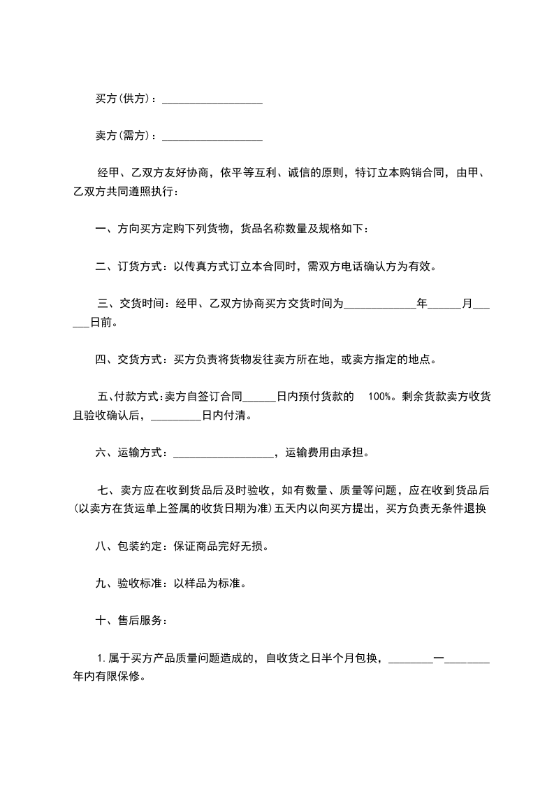 十四、本合同一式两份,甲乙双方各执一份,并自签字之日起生效,双方例行完本次购销事宜后,合同终止。