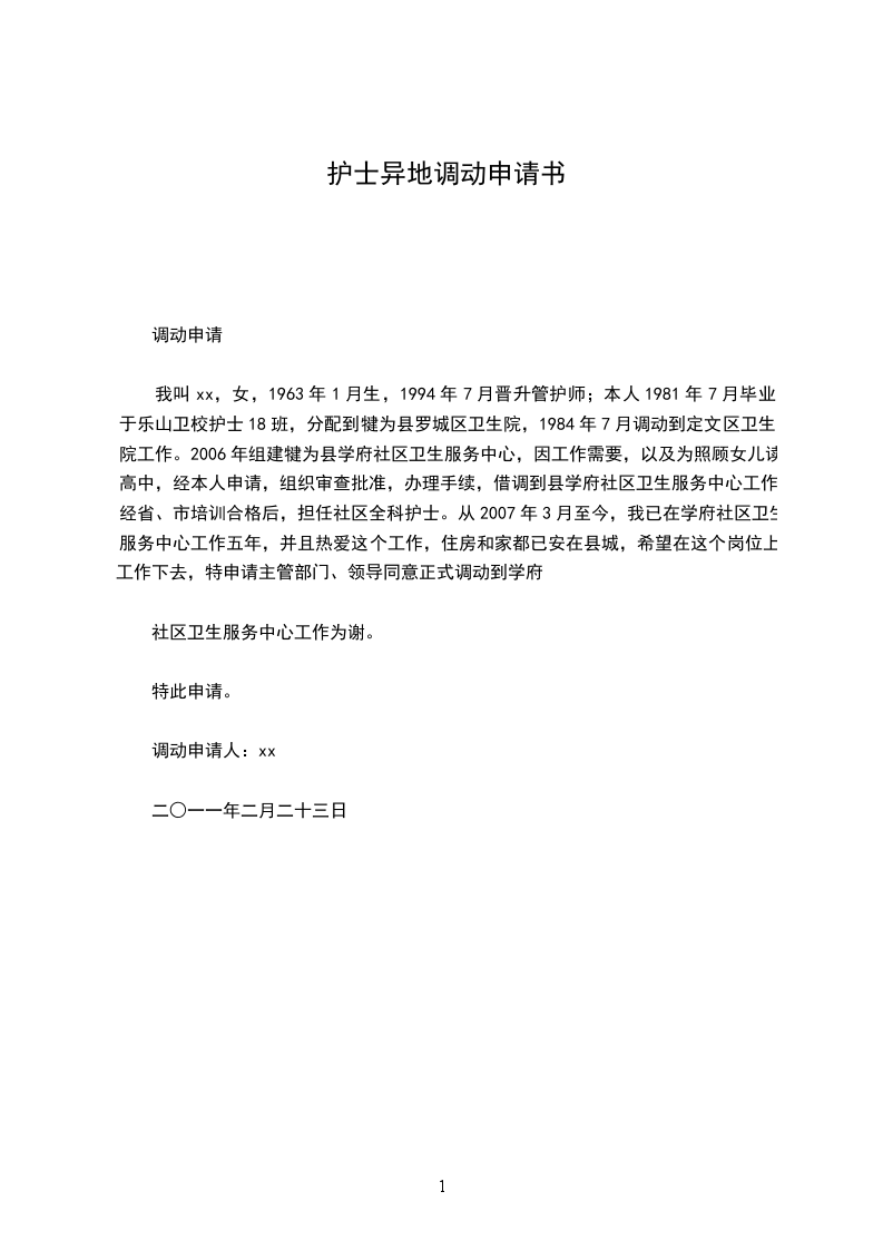 我叫xx,女,1963年1月生,1994年7月晋升管护师;本人1981年7月毕业于乐山卫校护士18班,分配到犍为县罗城区卫生院,1984年7月调动到定文区卫生院工作。2006年组建犍为县学府社区卫生服务中心,因工作需要,以及为照顾女儿读高中,经本人申请,组织审查批准,办理手续,借调到县学府社区卫生服务中心工作,经省、市培训合格后,担任社区全科护士。从2007年3月至今,我已在学府社区卫生服务中心工作五年,并且热爱这个工作,住房和家都已安在县城,希望在这个岗位上工作下去,特申请主管部门、领导同意正式调动到学府