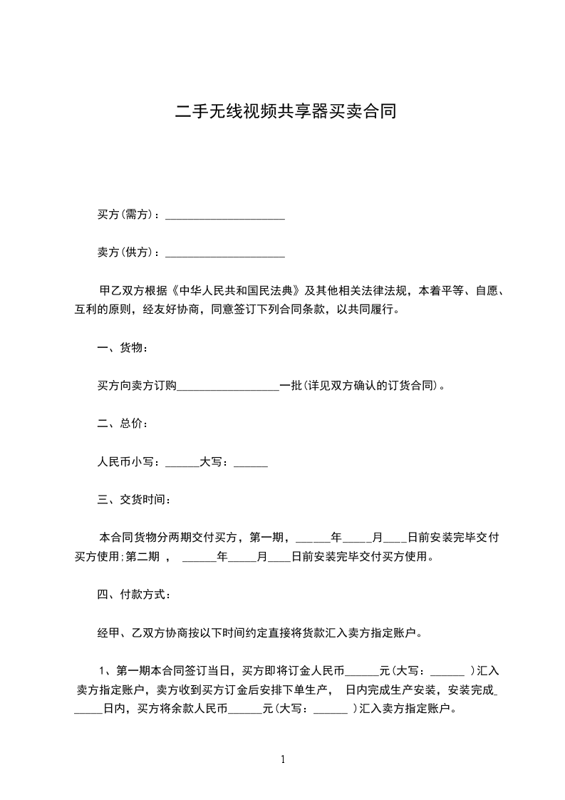 1、第一期本合同签订当日,买方即将订金人民币______元(大写:______ )汇入卖方指定账户,卖方收到买方订金后安排下单生产, 日内完成生产安装,安装完成______日内,买方将余款人民币______元(大写:______ )汇入卖方指定账户。
