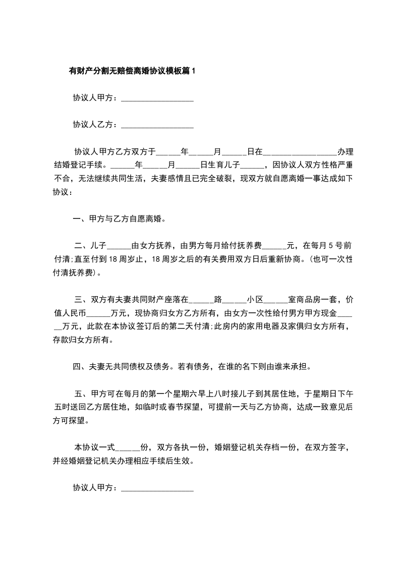 男方与女方于______年____月相识,并于______年____月____日在_________民政局登记结婚,婚后于______年____月____日生育一儿子,名_________。因____________________________致使夫妻双方感情破裂,且已无任何和好可能,现经双方自愿协商达成一致意见,订立离婚协议如下: