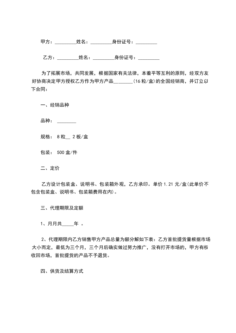2 .本合同一式二份,均为正本,双方各执一份,甲、乙双方各执一份,乙方须在合同签定日期起7日内向甲方交纳全额市场保证金,以取得所在地区独家代理权,合同自首批进货后生效。