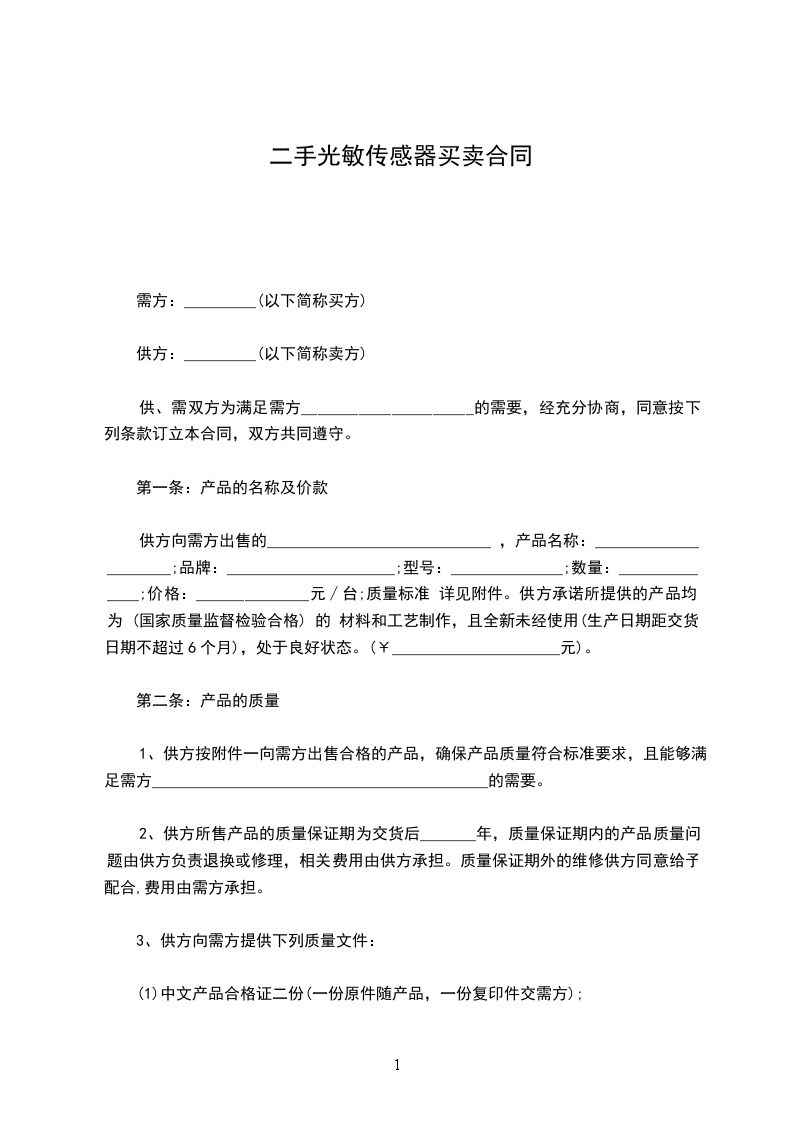 供方向需方出售的____________________________ ,产品名称:_____________________;品牌:_____________________;型号:______________;数量:______________;价格:______________元∕台;质量标准 详见附件。供方承诺所提供的产品均为 (国家质量监督检验合格) 的 材料和工艺制作,且全新未经使用(生产日期距交货日期不超过6个月),处于良好状态。(¥_____________________元)。