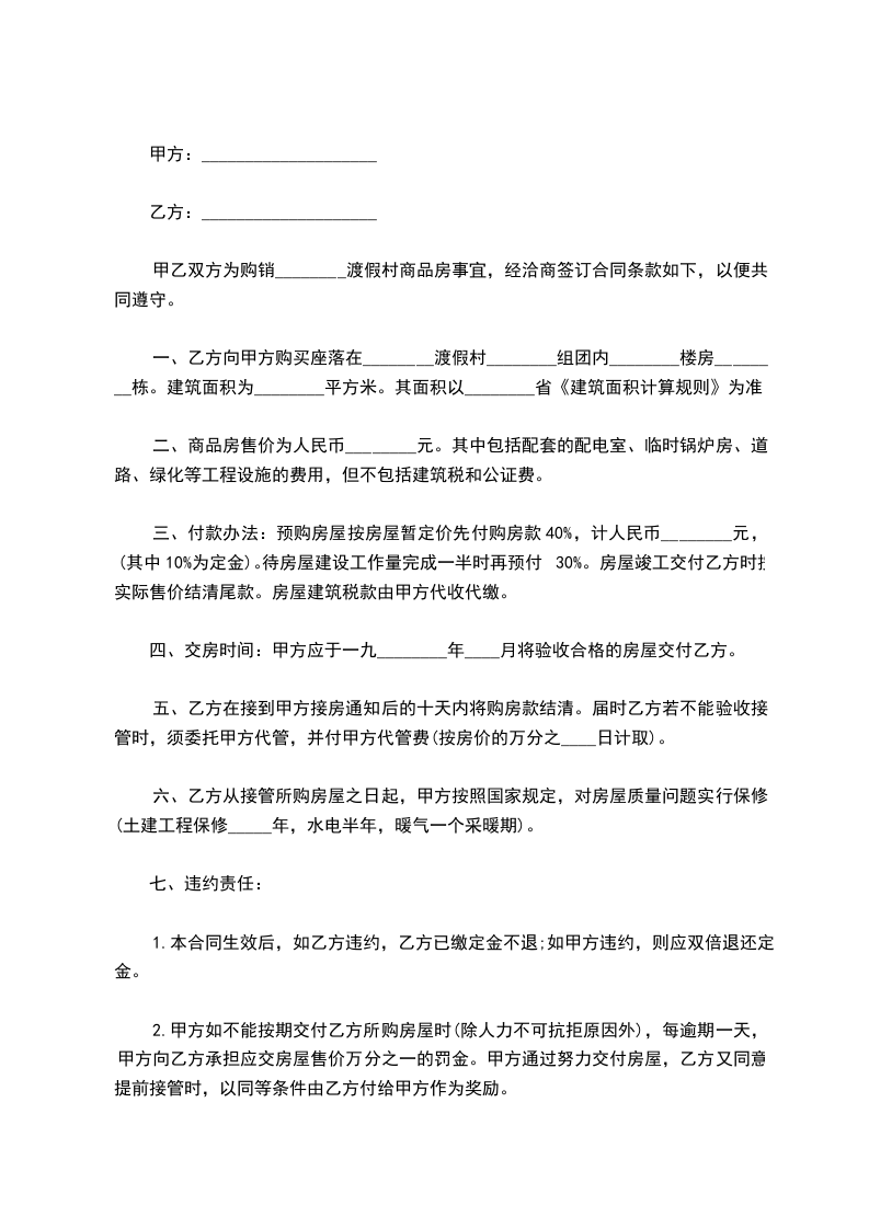 1. 甲、乙双方合同签订后,乙方中途悔约,应书面通知甲方,甲方应在3个工作日内,将乙方的已付款(不计利息)返还乙方,但购房定金归甲方所有。甲方中途悔约,应书面通知乙方,并自悔约之日起3个工作日内应将乙方所付定金的双倍及已付款返还给乙方。