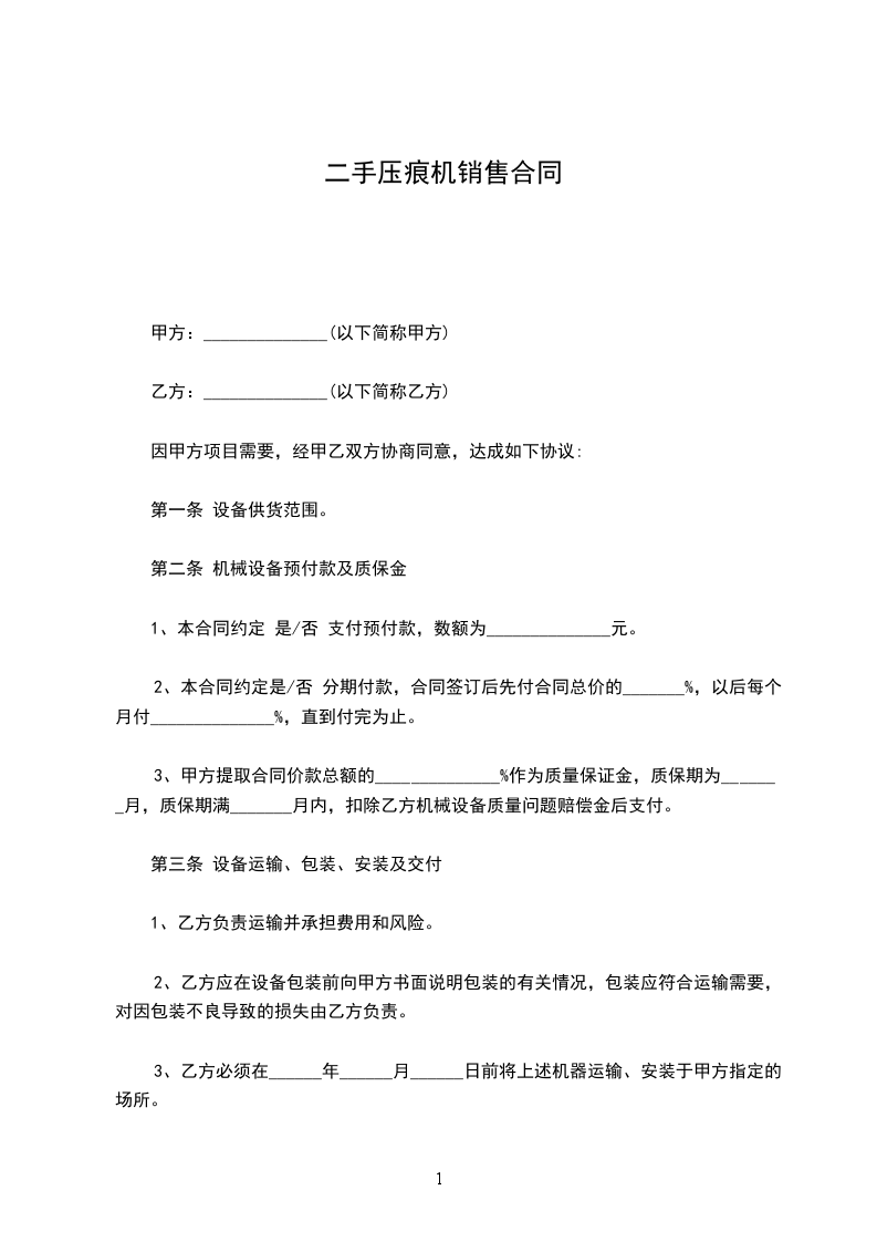 1、乙方保证出售的机器设备是全新未使用的,所具有的性能与说明书和国家相关标准相符。