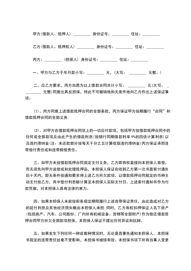 2、甲方以其购买的该车辆为乙方提供质押反担保(如甲方违约造成不能按时还款,乙方将车辆抵押给银行)。现双方就乙方向甲方提供保证担保及相关事宜,在遵循平等、公平、诚实、信用的原则基础上,经过充分协商,订立如下条款: