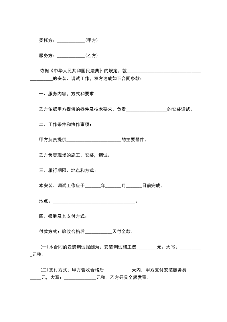 1.在设备安装调试时,如卖方提出,买方应为卖方人员的饮食提供方便,其费用由卖方自理。