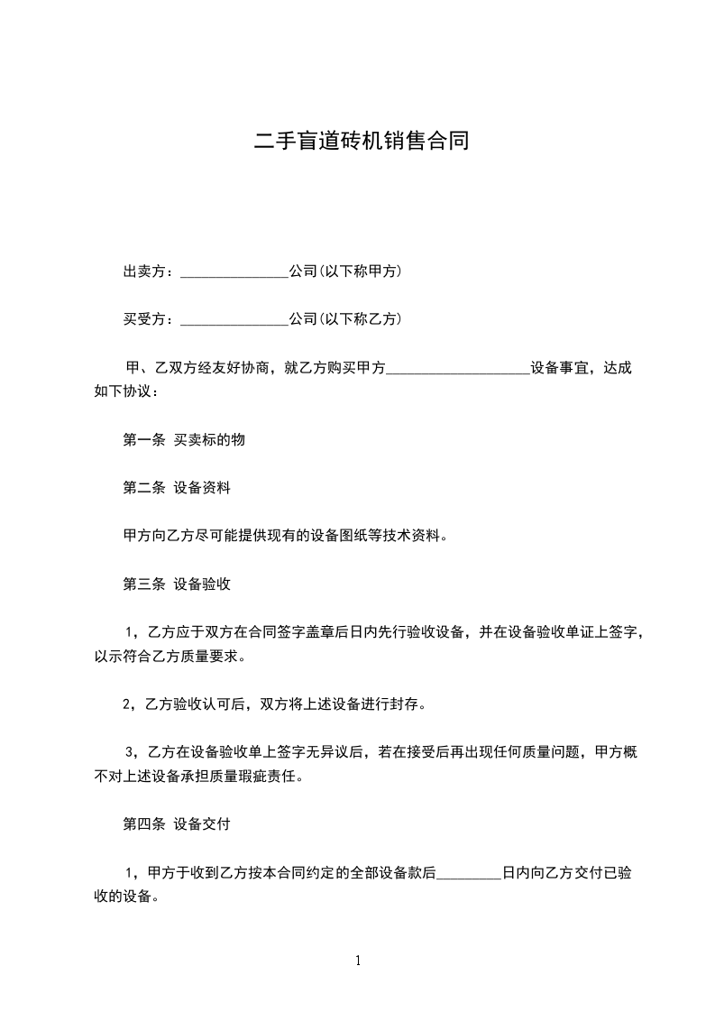 1、验收时间:卖方应于合同生效后_______天内完成设备安装调试,安装调试完毕后,买方应在 天内安排初步验收。设备于合同生效后_____天内通过双方的合格验收并由买方出具验收合格书。