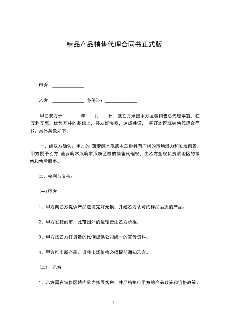 1、为服务广大消费者,乙方在代____区域内经营,若消费者不满意或证实属产品质量问题, 甲方需无条件提供退换货。