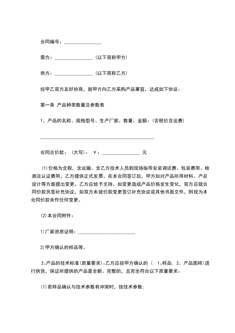 2、产品的技术标准(质量要求):乙方应按甲方确认的 (1、样品;2、产品图样)进行供货,保证所提供的产品是全新、完整的,且完全符合以下质量要求: