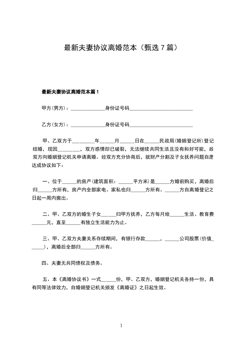 最新夫妻离婚协议书范文篇1