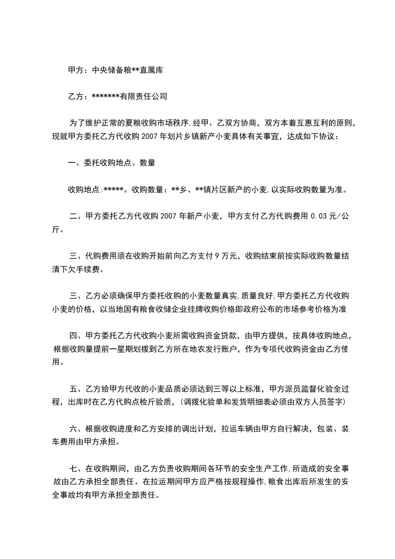 为了维护正常的夏粮收购市场秩序,经甲、乙双方协商,双方本着互惠互利的原则,现就甲方委托乙方代收购2007年划片乡镇新产小麦具体有关事宜,达成如下协议: