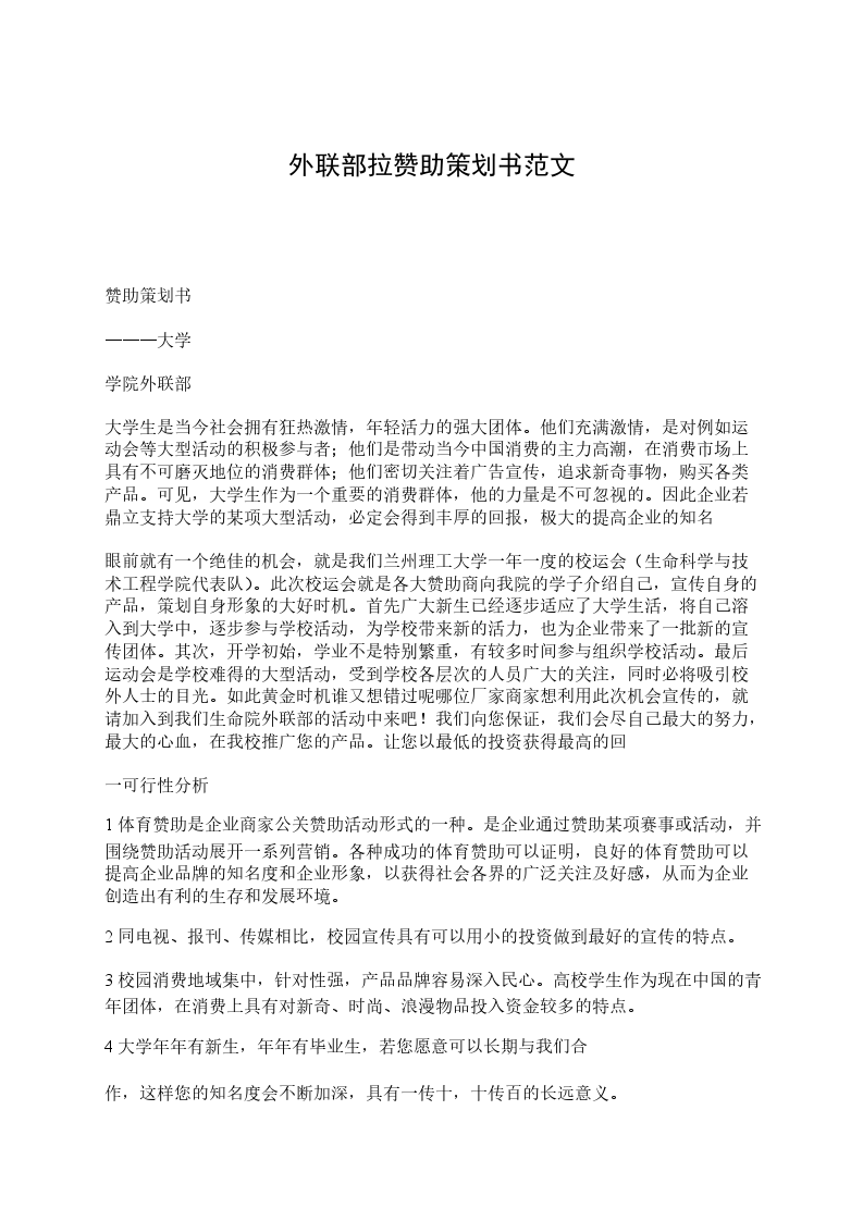 于200_年_月_日举办一个全校性的综合型运动会,历时一周。期间包括三个部分:开幕式文艺演出、运动会和闭幕式颁发奖项(两天)。我们校学生会外联部是此类校园活动指定宣传策划单位,对商家赞助大学生活动的可行性,特别是赞助我校运动会活动的可行性有较深入的了解。现在就让我们为贵公司作此赞助可行性报告。