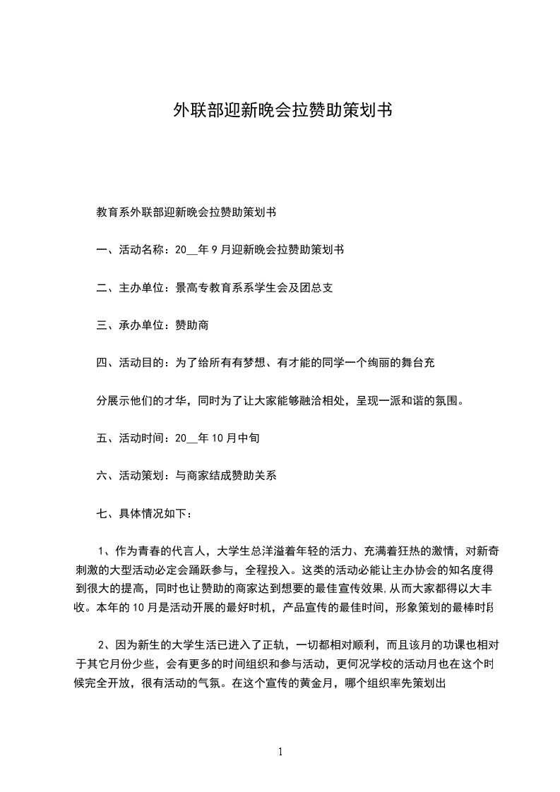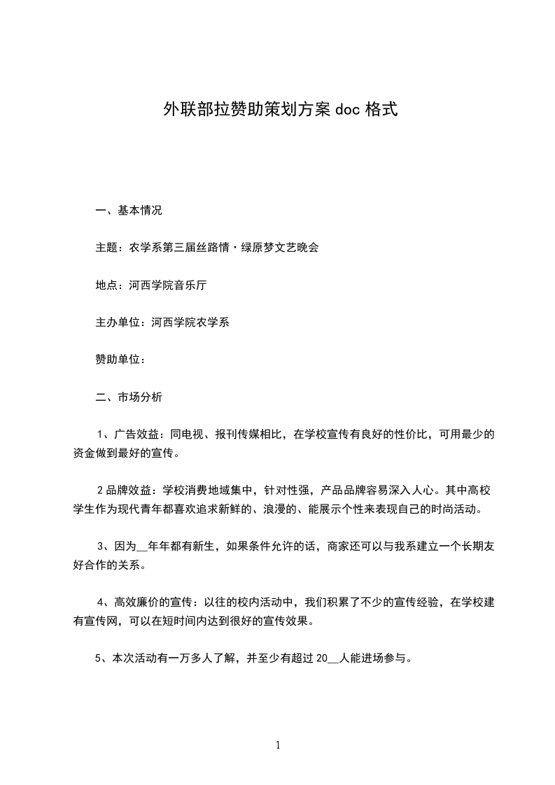 我们真心的希望能够以此次活动为契机,和贵公司建立更长久的合作关系,帮助贵公司不仅在校内,而且在社会上的最大的利益的实现。我们将在以后的工作为贵公司提供更大支持。活动地点:__体育场