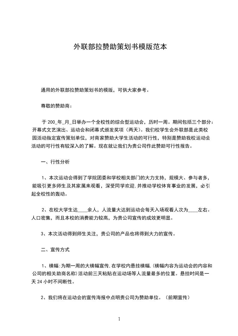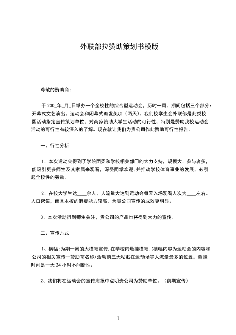 希望贵公司能慎重考虑我们的建议,给我们提出宝贵的意见.所有在校内的宣传活动由我们负责,公司可以派人监督.希望能和贵公司通力合作,共同搞好这次运动会,期望贵公司尽快回复.期待您的加入!合作愉快!