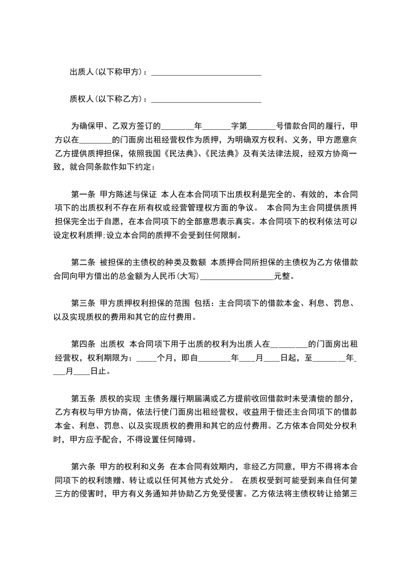 为确保甲、乙双方签订的________年_______字第_______号借款合同的履行,甲方以在________的门面房出租经营权作为质押,为明确双方权利、义务,甲方愿意向乙方提供质押担保,依照我国《民法典》及有关法律法规,经双方协商一致,就合同条款作如下约定: