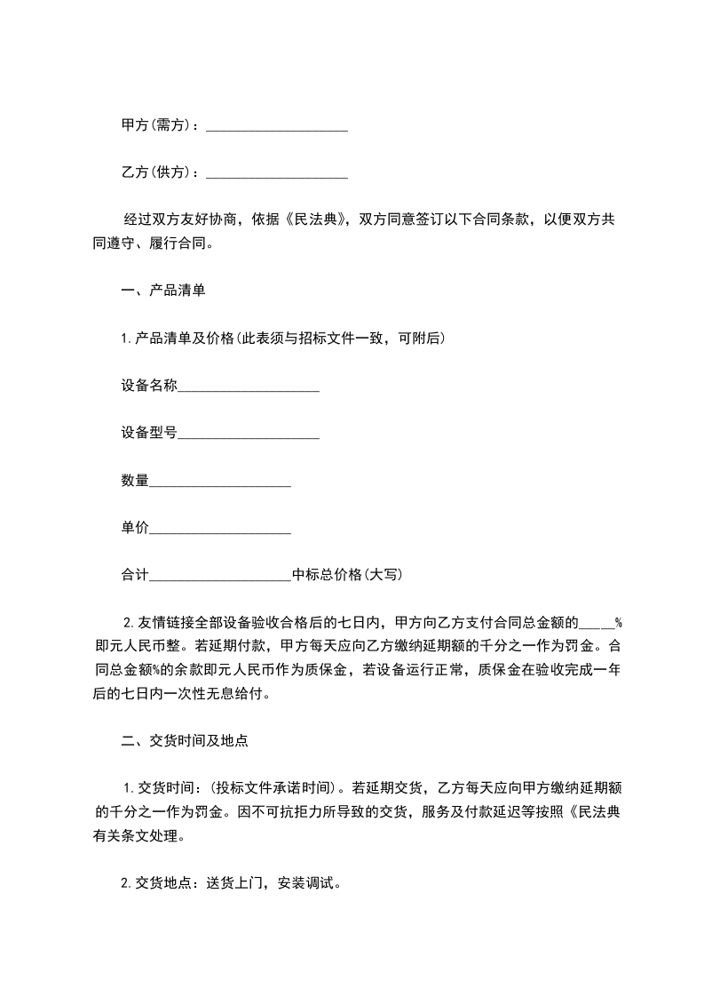 1.交货时间:(投标文件承诺时间)。若延期交货,乙方每天应向甲方缴纳延期额的千分之一作为罚金。因不可抗拒力所导致的交货,服务及付款延迟等按照《民法典》有关条文处理。