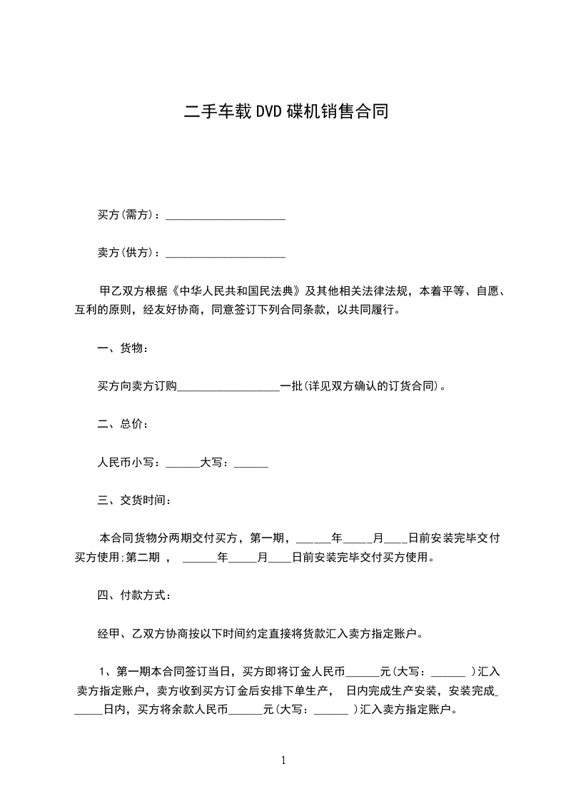 1、第一期本合同签订当日,买方即将订金人民币______元(大写:______ )汇入卖方指定账户,卖方收到买方订金后安排下单生产, 日内完成生产安装,安装完成______日内,买方将余款人民币______元(大写:______ )汇入卖方指定账户。