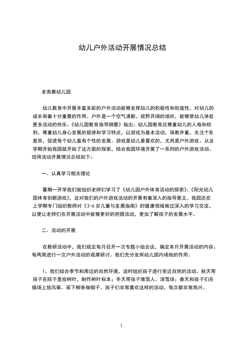 幼儿教育中开展丰富多彩的户外活动能够发挥幼儿的积极性和创造性,对幼儿的成长有着十分重要的作用。户外是一个空气清新,视野开阔的场所,能够使幼儿体验更多活动的快乐。《幼儿园教育指导纲要》指出:幼儿园教育应尊重幼儿的人格和权利,尊重幼儿身心发展的规律和学习特点,以游戏为基本活动,保教并重,关注个别差异,促进每个幼儿富有个性的发展。游戏是幼儿最喜欢的,尤其是户外游戏。从这学期开始我园就开始了这方面的探索,结合我园环境开展了一系列的户外游戏活动。现将活动开展情况总结如下:
