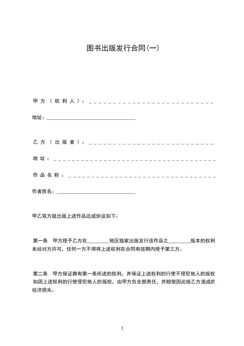 第一条 甲方授予乙方在_________地区独家出版发行该作品之_________版本的权利。未经对方许可,任何一方不得将上述权利在合同有效期内授予第三方。
