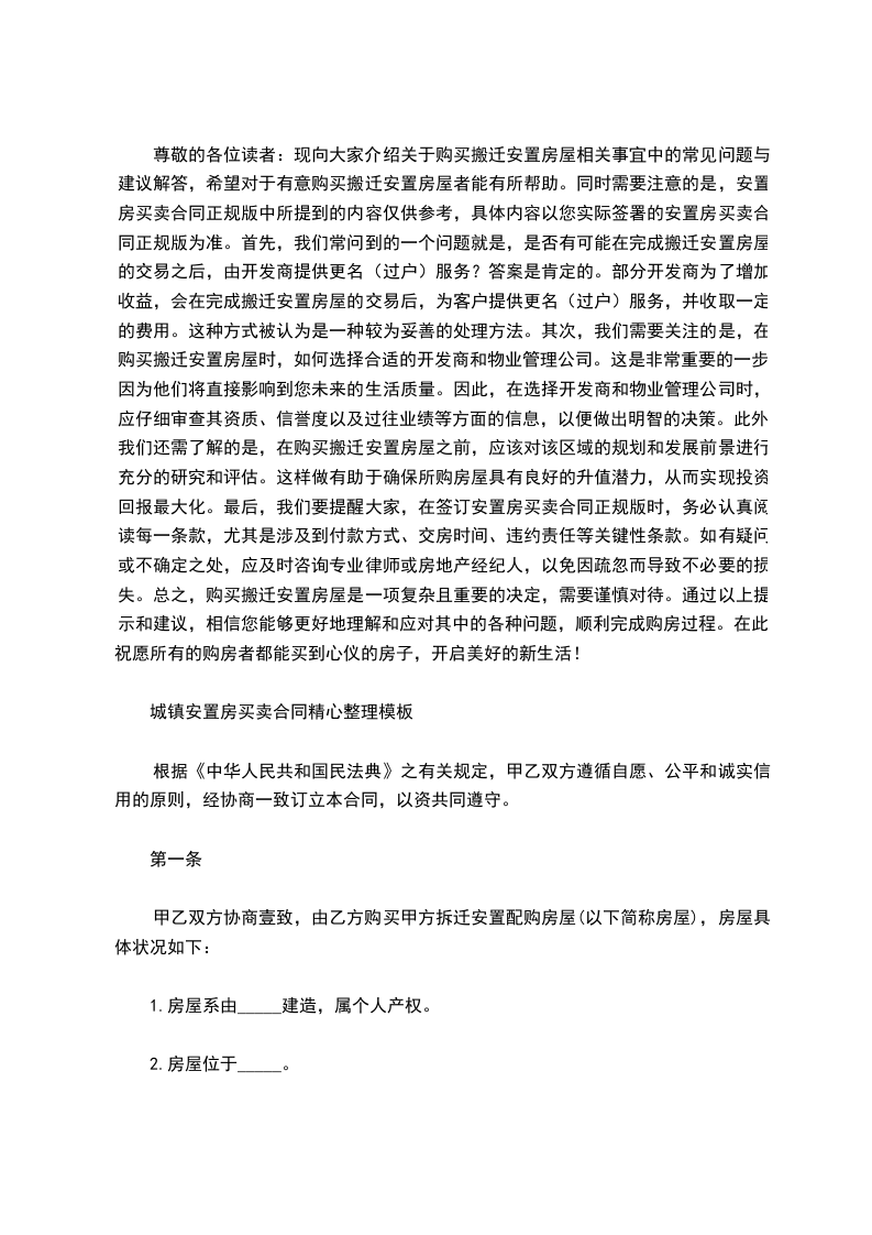 第一条 房屋的基本情况:甲方因拆迁获得该房屋的安置,房屋坐落在 ,建筑面积 ,房屋用途为 ,并附带 一间,位于 ,面积 平方米。乙方对甲方的房屋做了充分了解,愿意购买该房屋。