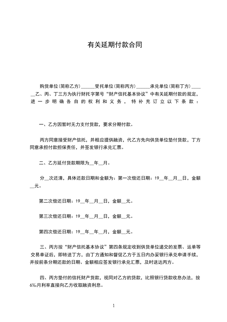 乙、丙、丁三方为执行财托字第____号“财产信托基本协议”中有关延期付款的规定,进一步明确各自的权利和义务,特补充订立以下条款: