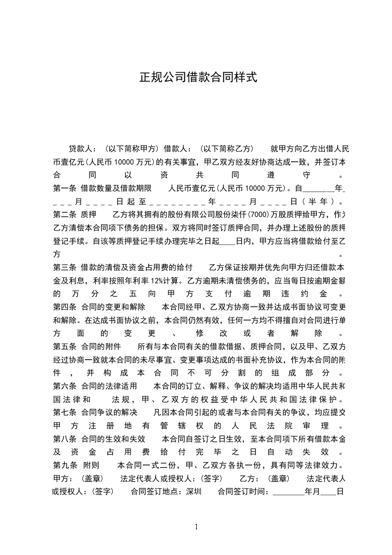 一. 甲方同意无息借款给乙方,作为生产经营流动资金。