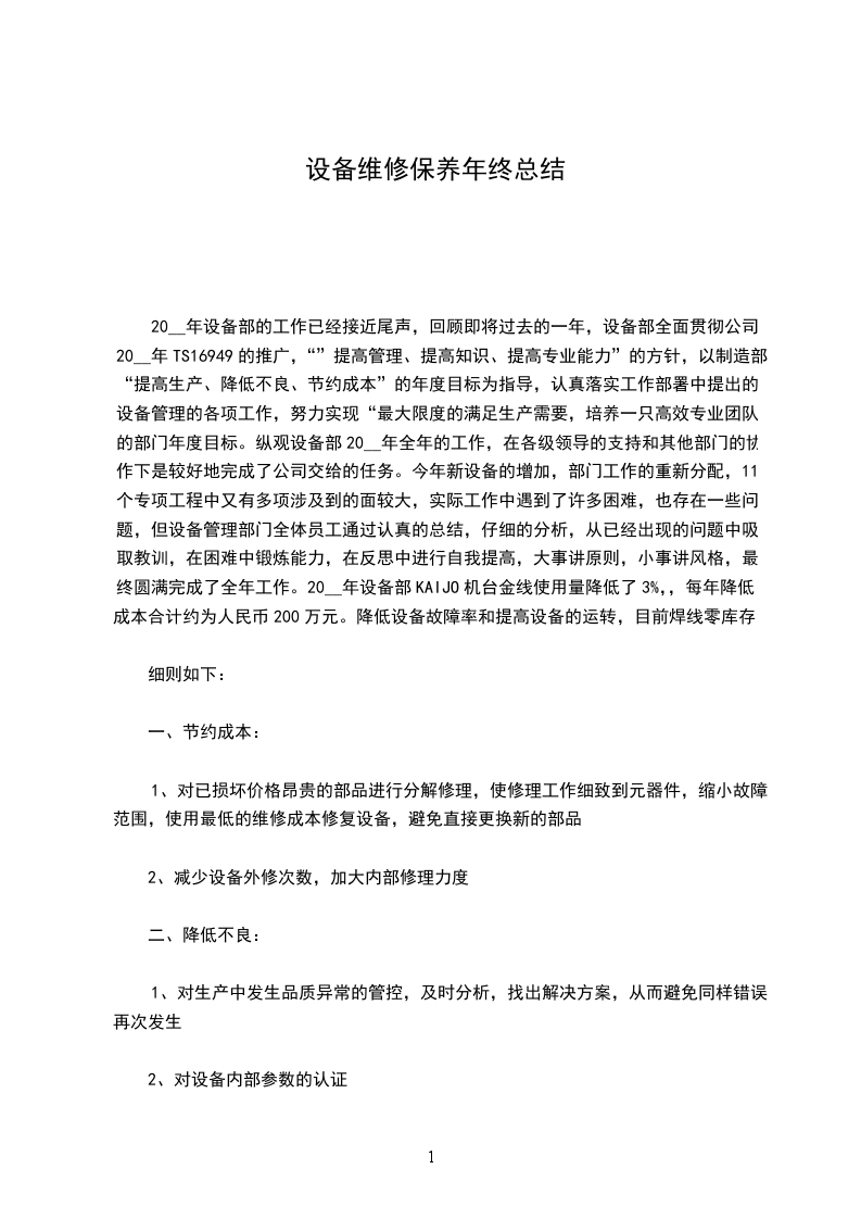 20__年设备部的工作已经接近尾声,回顾即将过去的一年,设备部全面贯彻公司20__年TS16949的推广,“”提高管理、提高知识、提高专业能力”的方针,以制造部“提高生产、降低不良、节约成本”的年度目标为指导,认真落实工作部署中提出的设备管理的各项工作,努力实现“最大限度的满足生产需要,培养一只高效专业团队”的部门年度目标。纵观设备部20__年全年的工作,在各级领导的支持和其他部门的协作下是较好地完成了公司交给的任务。今年新设备的增加,部门工作的重新分配,11个专项工程中又有多项涉及到的面较大,实际工作中遇到了许多困难,也存在一些问题,但设备管理部门全体员工通过认真的总结,仔细的分析,从已经出现的问题中吸取教训,在困难中锻炼能力,在反思中进行自我提高,大事讲原则,小事讲风格,最终圆满完成了全年工作。20__年设备部KAIJO机台金线使用量降低了3%,,每年降低成本合计约为人民币200万元。降低设备故障率和提高设备的运转,目前焊线零库存
