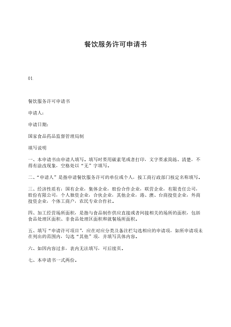 餐饮服务许可申请书