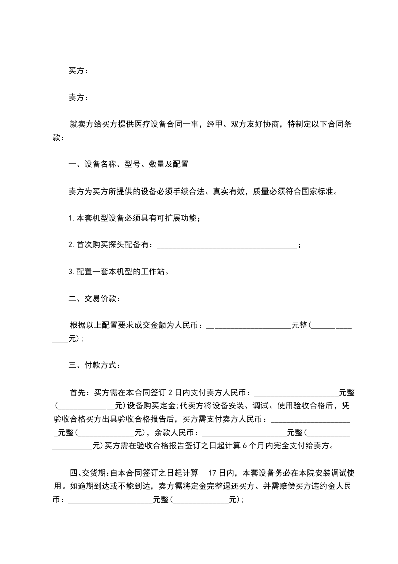 就卖方给买方提供医疗设备合同一事,经甲、双方友好协商,特制定以下合同条款: