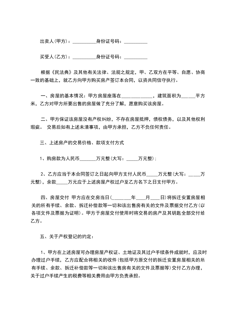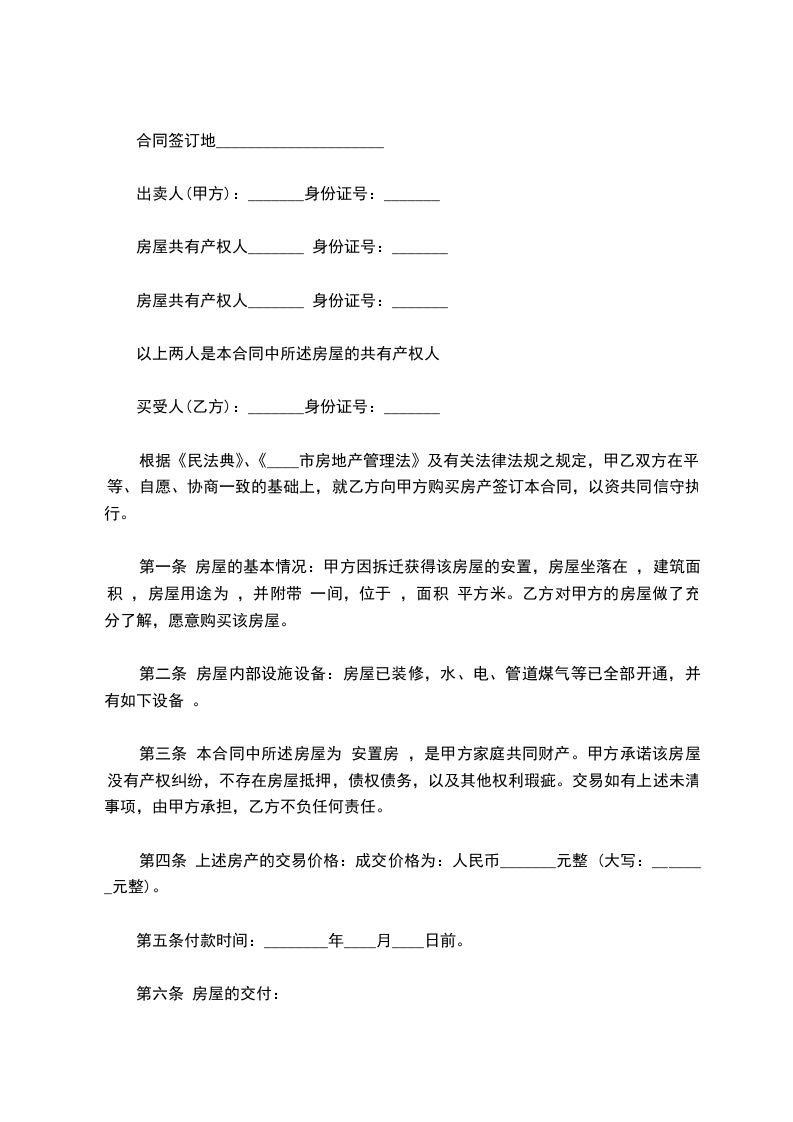 四、房屋交付 甲方应在交房当日(________年____月____日)将拆迁安置房屋相关的所有手续、余款、拆迁补偿款等一切和该出售房有关的文件及票据交付乙方(以各项文件及票据为证明)。甲方于房屋交付使用时将交易的房产及其钥匙全部交付给乙方。