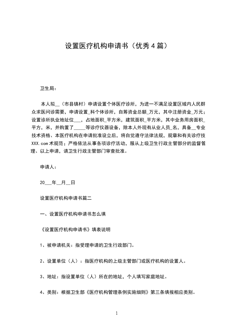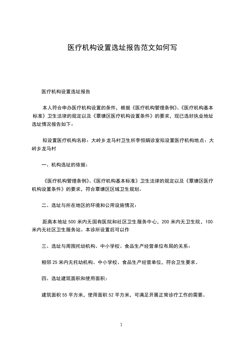 本人符合申办医疗机构设置的条件,根据《医疗机构管理条例》、《医疗机构基本标准》卫生法律的规定以及《覃塘区医疗机构设置条件》的要求,现已选好执业地址,选址情况报告如下: