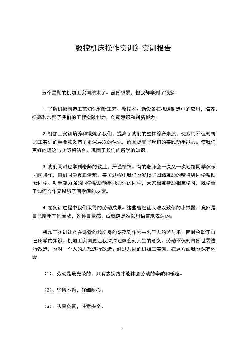 机加工实训让久在课堂的我切身的感受到作为一名工人的苦与乐,同时检验了自己所学的知识。机加工实训更让我深深地体会到人生的意义。劳动不仅对自然世界进行改造,也对一个人的思想进行改造。经过几周的机加工实训,在这方面我也深有体会: