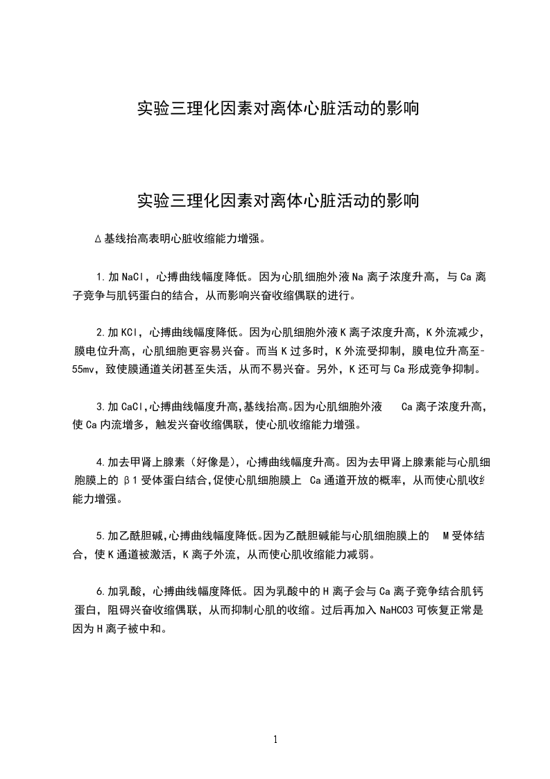 1.加NaCl,心搏曲线幅度降低。因为心肌细胞外液Na离子浓度升高,与Ca离子竞争与肌钙蛋白的结合,从而影响兴奋收缩偶联的进行。
